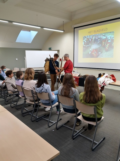 Quintus, Romeinse legionair uit de 1ste eeuw n.C., kwam zich voorstellen aan onze leerlingen van 3 en 4 KT. Hij legde uit wat hij allemaal moet meesleuren op dagmars, hoe zijn dagelijks leven eruit zag, welke wapens hij gebruikte en wat zijn aandeel was in een veldslag.
