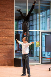Twee oud-leerlingen, Josse De Broeck en Axel Guérin, maakten de avond wat spectaculair met hun acrobatische stunts.